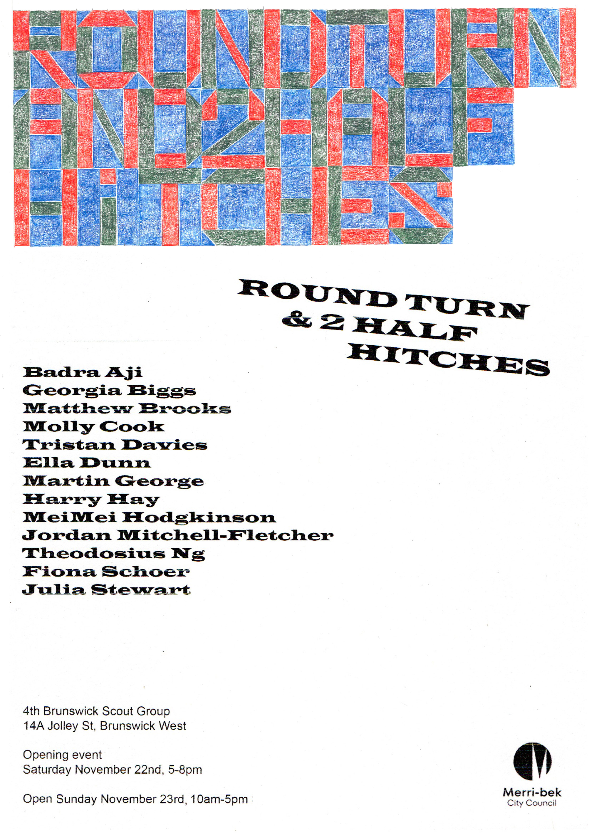 All are welcome to join us for the opening of ROUND TURN & 2 HALF HITCHES, a group show in a scout hall. This exhibition has been organised by Marlee McMahon, Badra Aji and Ella Dunn with the support of the Flourish Grant from the City of Merri-bek.